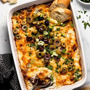 For pretty presentation, you can reserve a handful of olives when you’re folding them into the dip. Then when the dip is baked toss the reserved olives on top of the dip and garnish with parsley. I like to do this when I’m serving it for guests so that everyone knows there is olives in it.