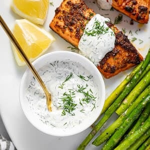 - Serve this sauce with air-fried salmon! While the salmon cooks in the air fryer – in just 10 minutes! – you can throw this easy dill sauce together. The two pair perfectly and after you try them together, you’ll never want salmon any other way! Both recipes only take a few minutes to prep and come together for a delicious and fast family dinner.