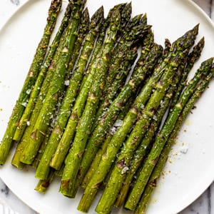 - Drizzle with Parmesan sauce! You can eat this air fryer asparagus with almost anything but my 15 minute garlic parmesan sauce takes it to the next level. Or try sprinkling this air fryer asparagus with grated Parmesan cheese to add some nutty flavor.