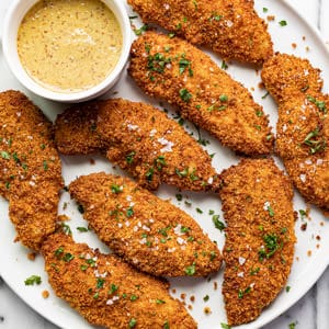 - Spray the olive oil spray several inches above the tenders so that it doesn’t blow all the breading off of the tenders.