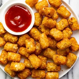 - Cook them in batches if you’re cooking a lot of tots. The tater tots will cook best when they’re spread in a single layer, with a bit of space in between. If you pack the tray or basket too tightly with tots, they will steam instead of crisp. Spread them out a bit to get perfectly crispy air fryer tater tots.