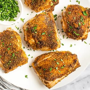 • To keep the skin crispy, just stick to dry seasonings, rather than marinating the chicken. Also, don’t forget to pat the chicken dry before seasoning. This will remove excess moisture and make the chicken skin super crispy. Feel free to broil the chicken thighs for 1-2 minutes to get the chicken skin extra crisp – but be sure to keep an eye on the broiler as it can take the chicken from crispy to burned in a matter of seconds!