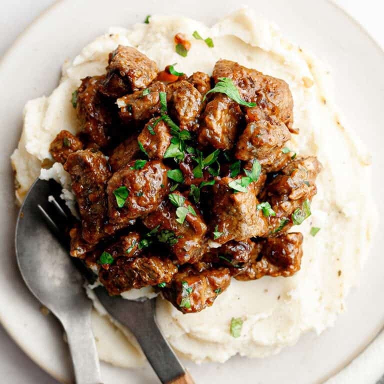 - Serve beef tips and gravy over garlic mashed potatoes. Garnish with fresh parsley and enjoy!