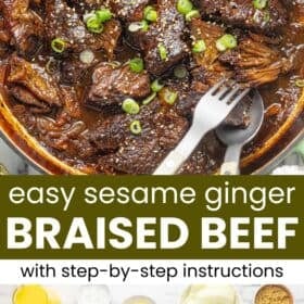 This orange sesame ginger braised beef recipe is rich, sweet, savory, gingery, and citrusy. The best part is that after a quick sear on the stove, the oven does all the work for you! The beef is juicy and fall-apart tender, and all you have to do is spoon it over rice and veggies with plenty of extra sauce!