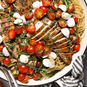 - You can serve each element of this bruschetta chicken pasta separately so that even the pickiest of eaters will enjoy it!ย If you’ve got picky eaters at home, trying serving the noodles, sliced chicken, bruschetta, and mozzarella separately and letting them assemble it on their own! This works great for our 4-year-old. Also, try serving this chicken bruschetta pasta with my super quick and easy garlic bread recipe!