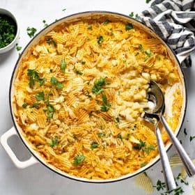 If you don’t have a pan that can go in the oven, just transfer the cheesy potato casserole mixture to an oven safe baking dish. That’s why I love my enameled cast iron pan because it can easily go from stove top to oven to the dining room table!