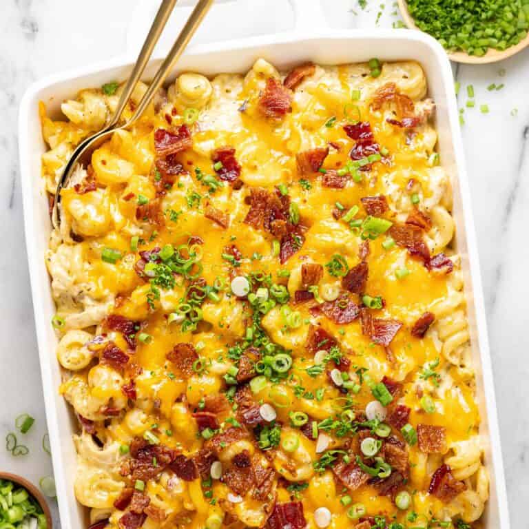 This chicken bacon ranch casserole is the perfect comfort food! It combines the classic flavors of ranch seasoning with a creamy mac and cheese sauce, al dente noodles, shredded rotisserie chicken, and crispy bacon. It’s all baked together for a cozy weeknight dinner your whole family will love!
