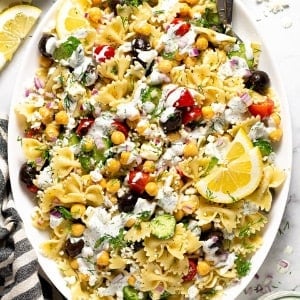 - It’s loaded with tons of flavor. You guys, this Greek chickpea pasta salad has TWO dressings!!?? This might seem like overkill but if you know me at all, you know that I’m OBSESSED with sauce. The simple vinaigrette takes just seconds to throw together and perfectly coats every noodle and veggie. Then the creamy yogurt sauce is drizzled over everything, tying it all together with that fresh lemon and dill flavor.