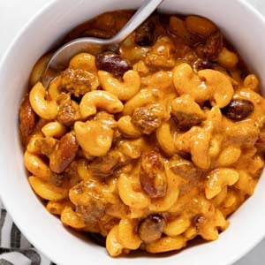Because it’s the best of both worlds! It combines two cozy comfort foods – homemade chili and macaroni and cheese – into one delicious dish that’s topped with ooey gooey melted cheese. The kick from the chili and the hearty ground beef and beans pair beautifully with a simple homemade mac and cheese for a creamy noodle dish with a hint of spice.