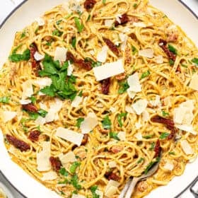 10 ingredients + 10 minutes = the easiest tomato cream sauce you’ve ever made! It’s loaded with sun dried tomatoes, just the right amount of cream and salty shaved Parmesan.