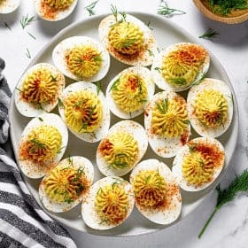 - Garnish each deviled egg with a sprinkle of paprika and a pinch of chopped dill. Enjoy!