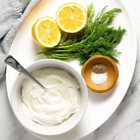 Don’t use fat free yogurt in this recipe! This recipe doesn’t have any fat in it, so using full fat Greek yogurt or sour cream is very necessary. The fat in the yogurt is also going to balance out the acid from the lemon juice.