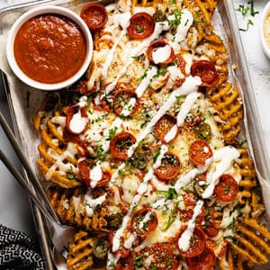 - If you don’t have a baking sheet, you can totally make these pizza fries in a 9×13 baking dish or a cast-iron skillet.Â