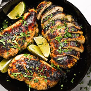 This cilantro lime chicken can be cooked on the grill or in a cast iron pan. If you don’t have cast iron, any pan will work, but cast iron will give it that great crispy, dark golden-brown crust.