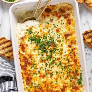 - Transfer to a 9×9 baking dish and spread in an even layer. Top with remaining mozzarella cheese. Bake for 25-30 minutes or until the dip is bubbly and the cheese on top is melted and starting to brown. Broil for 1-2 minutes until the top starts to get dark golden brown.