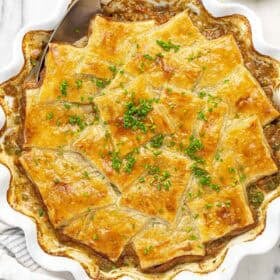 This French onion chicken pot pie is cozy, rich, and surprisingly simple to make with rotisserie chicken, frozen veggies, and flaky puff pastry. It’s a comforting, French onion–inspired dinner that feels special but is totally doable for a weeknight.