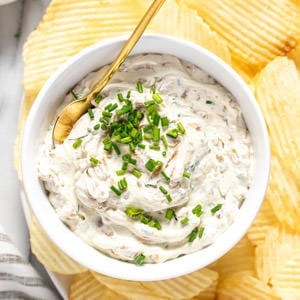 - Garnish with sliced chives, serve with Ruffles potato chips, and enjoy!