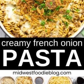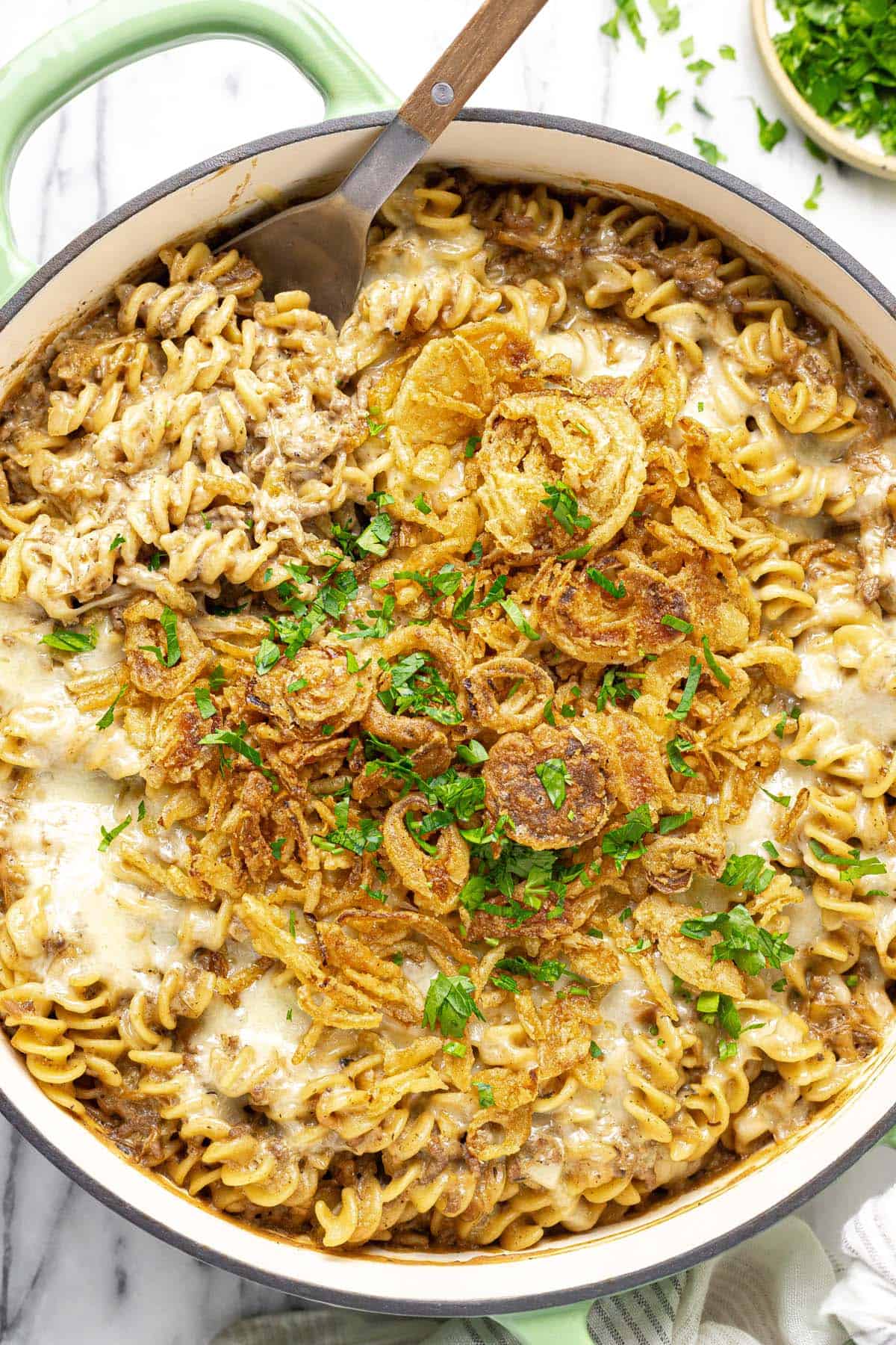 - Crispy Fried Onions: Add crunch and classic casserole vibes. They are totally optional, but also really delicious and a nice crunchy contrast to the creamy pasta.