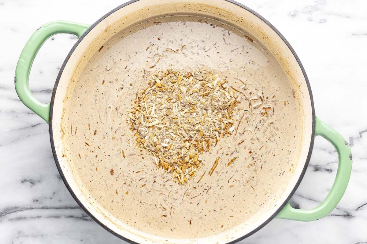 Then whisk in Worcestershire sauce, broth, half and half, and remaining onion soup mix.
