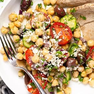 Switch up the veggies in this chickpea salad to suit your family’s taste or use up what you’ve got in the fridge. I’m not a huge raw tomato fan so I usually add extra sliced cucumber in their place. Sometimes we don’t have any fresh cucumber so I’ll add more olives instead. Customize this recipe and make it your own!