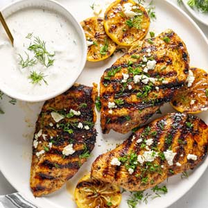 - Garnish with parsley, dill, crumbled feta, and lemon slices. Enjoy!