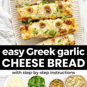 - I could gush about this Greek garlic bread all day. It is such a fun appetizer or easy vegetarian lunch. It’s almost like a Greek spinach and artichoke dip stuffed garlic cheese bread, and I guarantee everyone will be coming back for seconds and asking for the recipe!