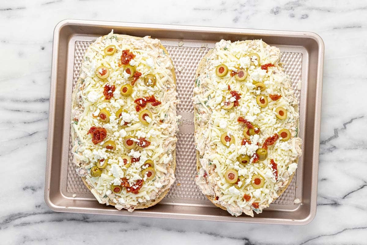 TOP WITH CHEESE + EXTRAS. Top with the remaining mozzarella and add feta, sun-dried tomatoes, and olives.Â