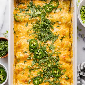 - If you’re looking for a way to make this a more well-rounded meal, try spreading an even layer of microwave Mexican rice over the bottom of the pan before you add the enchiladas and sauce. I like to use the microwave pouches of pre-made rice for ease. Instead of microwaving it, you can add it to the bottom of the enchiladas and it will heat up right along with your enchiladas. If you follow me on Instagram, you will see that I make my enchiladas this way almost every time!