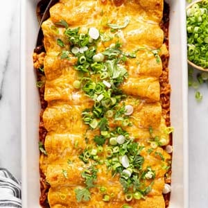 - Spray the tin foil with olive oil cooking spray before covering the enchiladas. This will ensure that the melty cheese doesn’t stick to the foil.