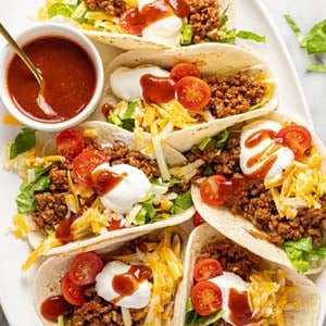 - Serve ground beef in flour tortillas with lettuce, cheese, sour cream, and taco sauce.