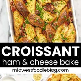 This easy ham and cheese croissant bake is a cozy make-ahead breakfast perfect for holidays or weekend brunch. Buttery croissants, savory ham, and melted Gruyere bake together in a creamy egg custard for a dish everyone will love.