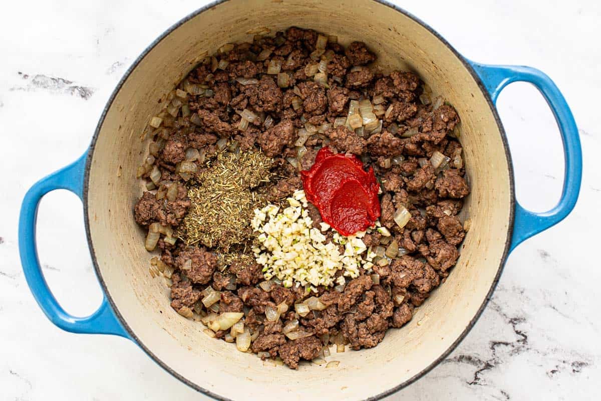 - Add garlic, tomato paste, andย Italian seasoningย and cook for another minute, stirring frequently.