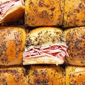 - Layer the ham across the bottom buns. Then layer the cheese on top. Add the top slab of buns.
