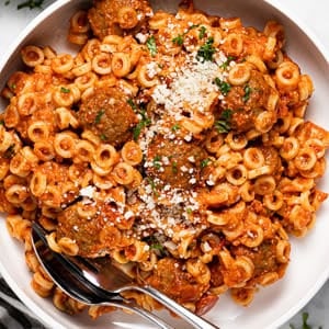 - If you’d rather make this dish vegetarian, you can omit the meatballs all together! This will make the overall dish slightly more saucey so you could either use 16 oz. of pasta or just enjoy a little added sauce!