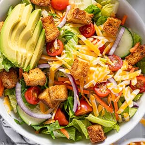A classic house salad recipe is the perfect thing to have in your back pocket for a dinner party or just a regular ol’ Wednesday night. Filled with fresh greens, crisp veggies, and crunchy croutons this house salad takes it a step further with creamy avocado lime ranch dressing. Add chicken and make it a meal or serve it as a veggie-loaded side with dinner.