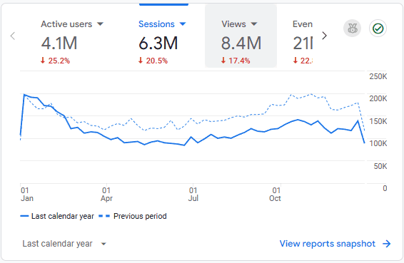 - You can see that around February/March, my traffic starts to drop and fall below where it had been the previous year. Then it just follows that trend, fluctuating about 20-30% lower at any given time, and finishing the year around 20% lower total.