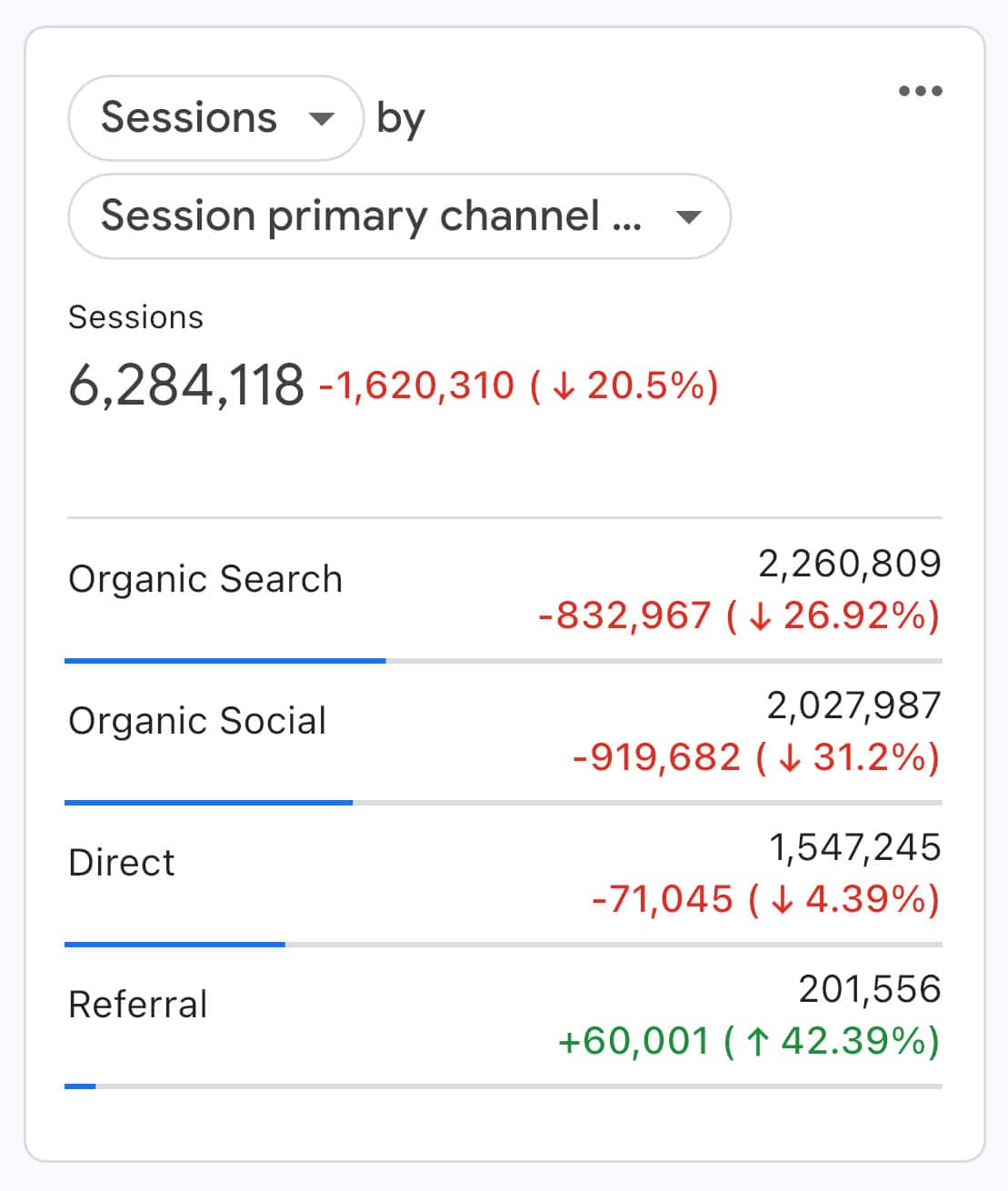- What I find even more interesting is that when you break down the traffic by source, organic, social, and direct are all down, but referral traffic is up.