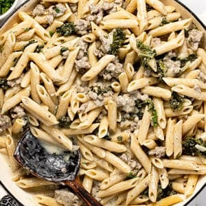 - Add kale, broth, half and half, and uncooked penne along with another pinch of salt and pepper.