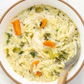 This creamy, lemony chicken orzo soup is the ultimate easy weeknight dinner. Everything cooks in one pot in about 30 minutes for minimal cleanup, and the simple combination of chicken, kale, and lemon makes it deliciously satisfying.