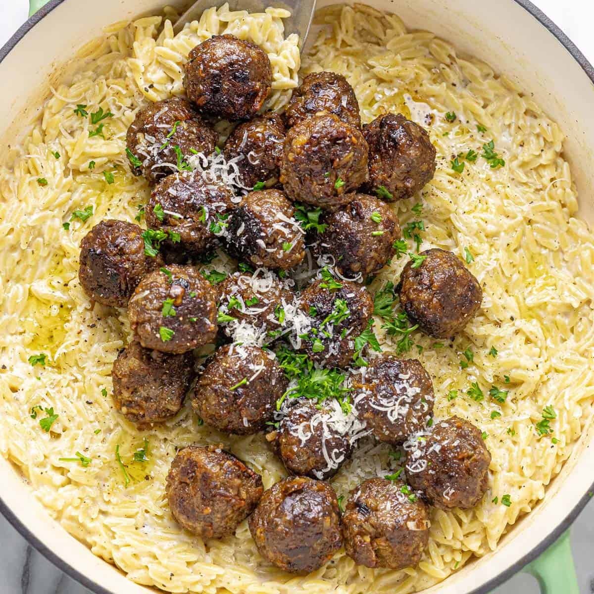 The Parmesan sauce in this one-pot pasta will thicken as it cools so if you’re planning to reheat leftovers, be prepared to add a couple splashes of milk or broth as you’re warming it up again. With that said, this pasta reheats well, just make sure to add some liquid and heat over medium heat in a saucepan or pot until it’s heated through.