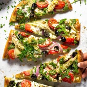This Mediterranean flatbread pizza is the perfect quick and easy vegetarian dinner for a busy weeknight! My 5-minute flatbread crust creates a crispy, crunchy base topped with homemade spinach pesto, mozzarella, feta, artichoke hearts, red onion, grape tomatoes, and black olives.