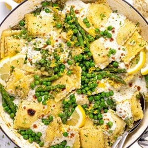 - It’s filled with spring-inspired flavors! The store-bought cheesy ravioli is tossed in a light, creamy lemon goat cheese sauce, and the peas and asparagus are cooked perfectly tender-crisp! Then it’s all topped with fresh mozzarella and broiled to golden brown perfection.