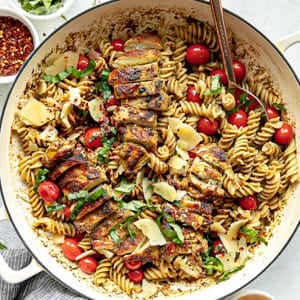 - Serve with pasta! Pesto chicken in white wine cream sauce is one of my favorite things to pair with pasta. Because of the sauce, I like to use a short pasta like rotini, penne, or rigatoni, but you can also use angel hair, linguine, or fettucine. All the flavors go so well together and the pasta fills out the dish. You can also serve this chicken with veggies, fries, or salad.