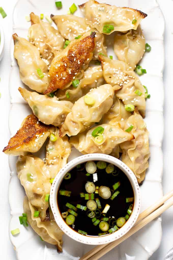 Close up shot of a pork dumpling being dipped in soy sauce with chopsticks