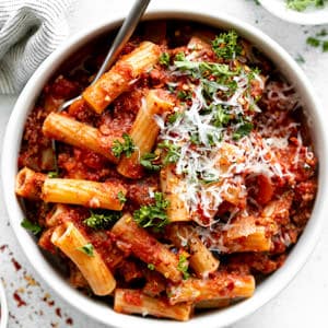 - Salt your pasta water! Add 2-4 tablespoons of Kosher salt to the pot of just after it comes to a boil and before adding the pasta. This is the first chance you have to season the pasta and the best way to boost the overall flavors of this rigatoni Bolognese. Don’t forget to save a bit of that pasta water to toss with the sauce and pasta later!