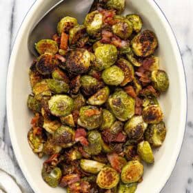 These roasted Brussels sprouts with bacon are the ultimate easy side dish. They’re crispy, caramelized, and packed with savory flavor! The best part is it’s a dump-and-bake, one-pan side dish that’s perfect for busy weeknights or holiday dinners.