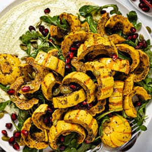 - Serve roasted squash over feta and greens. Top with pumpkin seeds and pomegranate seeds and enjoy!