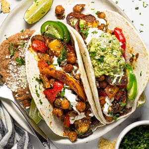 To reheat leftovers, just add the veggies to a saute pan over medium to medium-high heat and add a splash of water. Cook, stirring frequently and adding more water as needed until everything is heated through. I also like to make a double batch of these vegetarian fajitas at the beginning of the week and then add them to Sheet Pan Quesadillas, Sheet Pan Nachos, or Vegetarian Stuffed Peppers too!