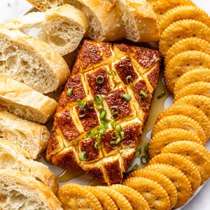 - Drizzle with honey and garnish with sliced green onion if desired. Serve with sliced French bread and Ritz crackers and enjoy!