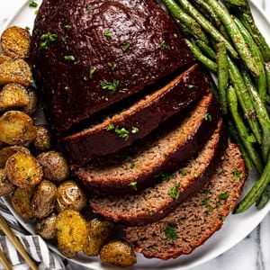 - Allow meatloaf to rest for a few minutes, slice, and serve with my air fryer green beans and herb roasted baby potatoes!